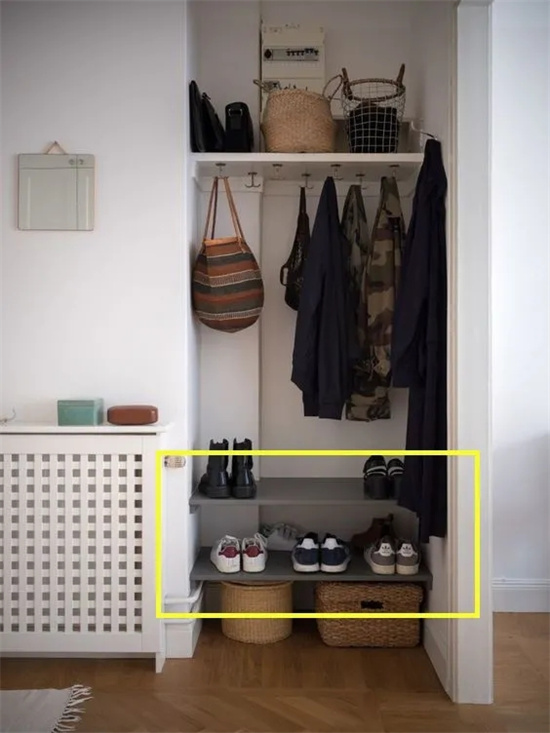 想给玄关装个柜子做衣物鞋子收纳,但是进门处空间也只有那么一点,而一般柜子的宽度都在600~800mm中间,装不好真的很占地。不妨试试这种嵌入式的玄关柜,没有储物柜堆积的现象,入墙也不占用外部走道空间,更适合小户型。