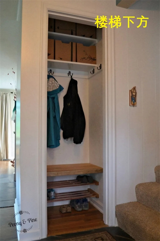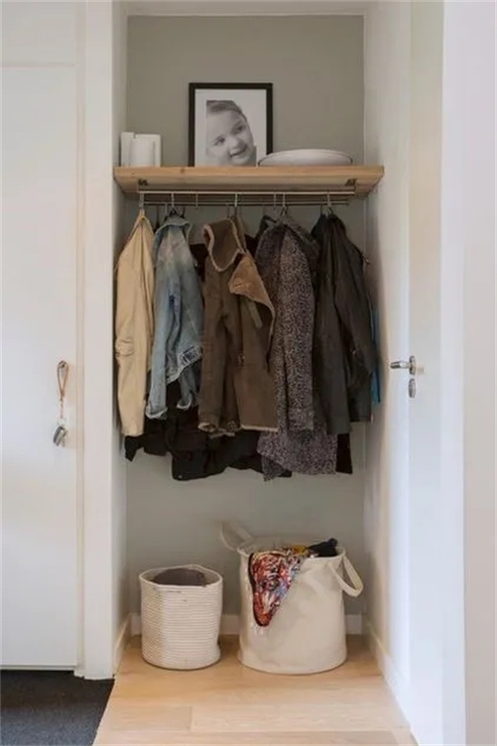 你们可以选择利用门后方空间,家里来人的时候门一关还能起到一个遮挡的作用,保护隐私也不占地。如果家里有两层的话,楼梯下方空间也能利用上,内嵌式的玄关柜空间,也能作为步入空间使用。